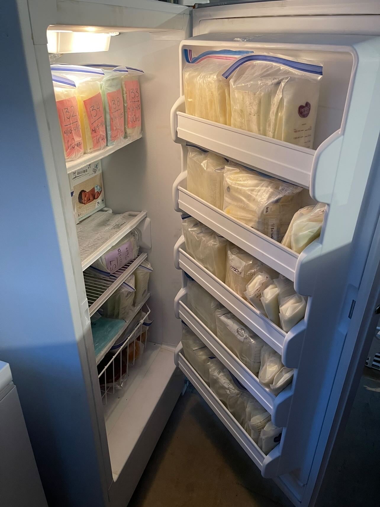 “While pregnant with our first baby in 2021, I always knew I would exclusively pump when I went back to work. Once my baby was here and we were in the fourth trimester, latching wasn’t going well. Overall, I struggled mentally a great deal for about a year. I switched to pumping earlier than planned, but I liked it. I felt like I had control, although I fell victim to feeling as though my worth was defined by ounces.With a surplus of breast milk in our freezer, I turned to donating it. After watching families suffer through the formula shortage in 2022, I knew donating my excess breast milk was my calling for this season of life. I found 2 families and donated to them for about a year, continuing to donate to other babies in between. After 15 months of pumping, I donated just over 9900 oz.