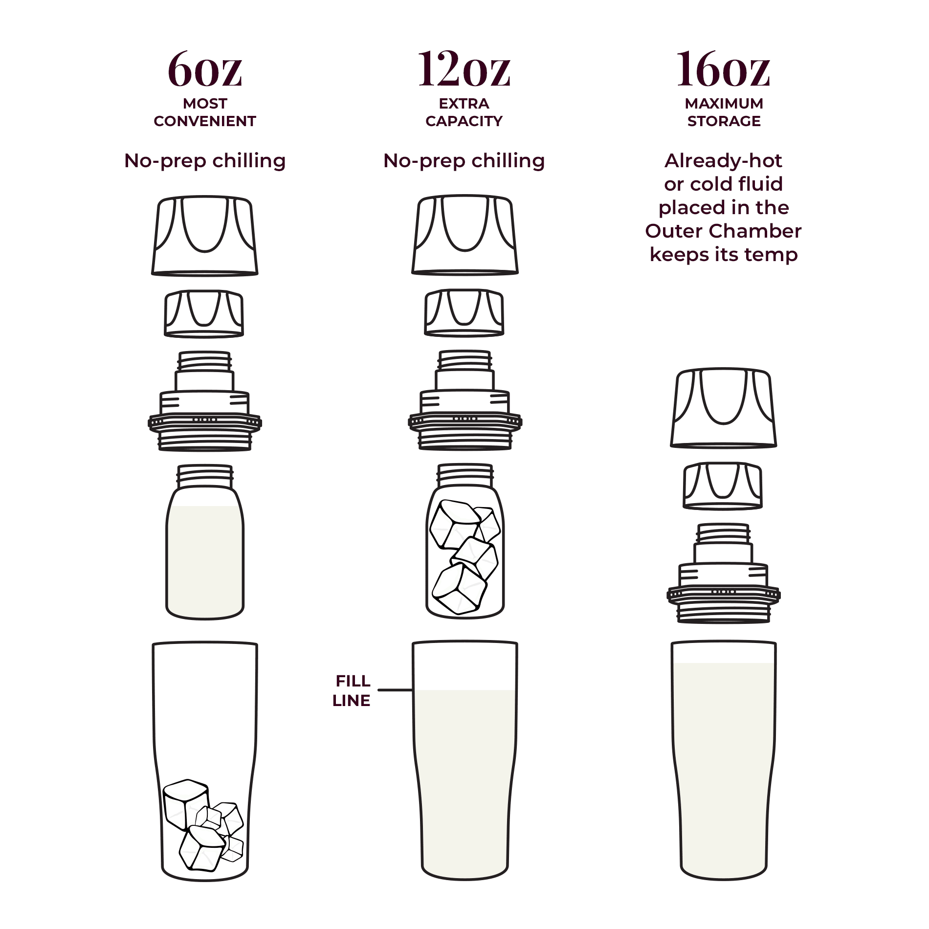 • (1) OG Chiller/Warmer (1 34oz Outer Chamber, 1 12oz Inner Chamber, 1 Connector, 1 Small Cap, 1 Upper Cup)
